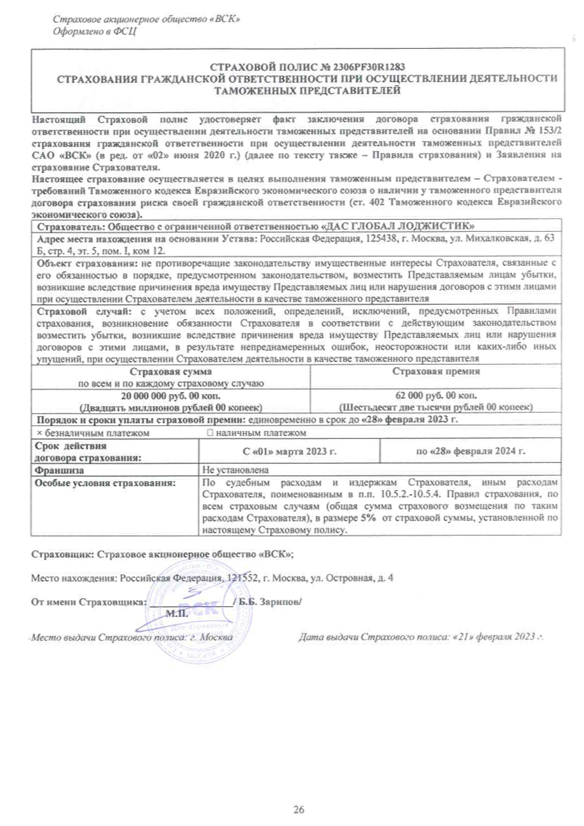 - Страховой полис (ОАО «ВСК») № 2306PF30R1283 от 01 Марта 2023 г. – страхование гражданской ответственности при осуществлении деятельности таможенных представителей.